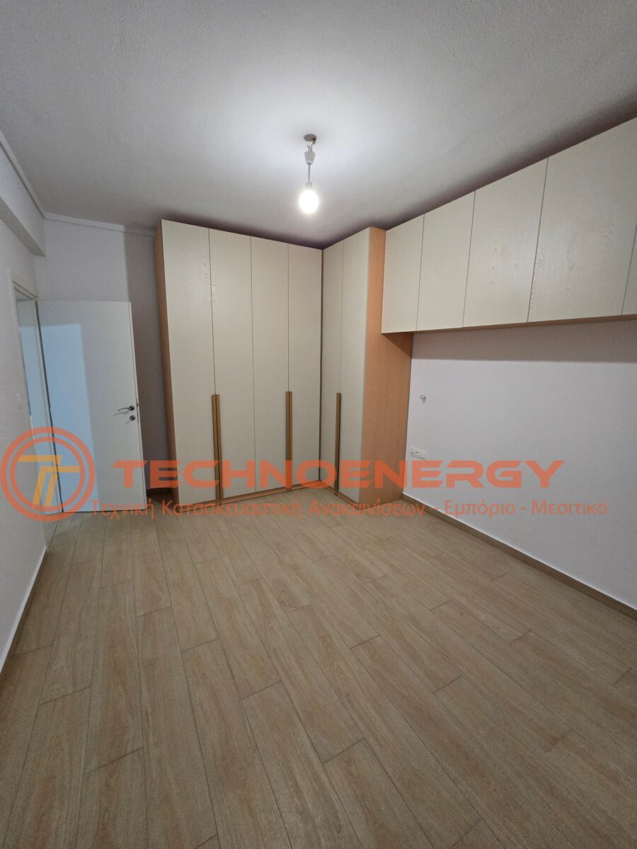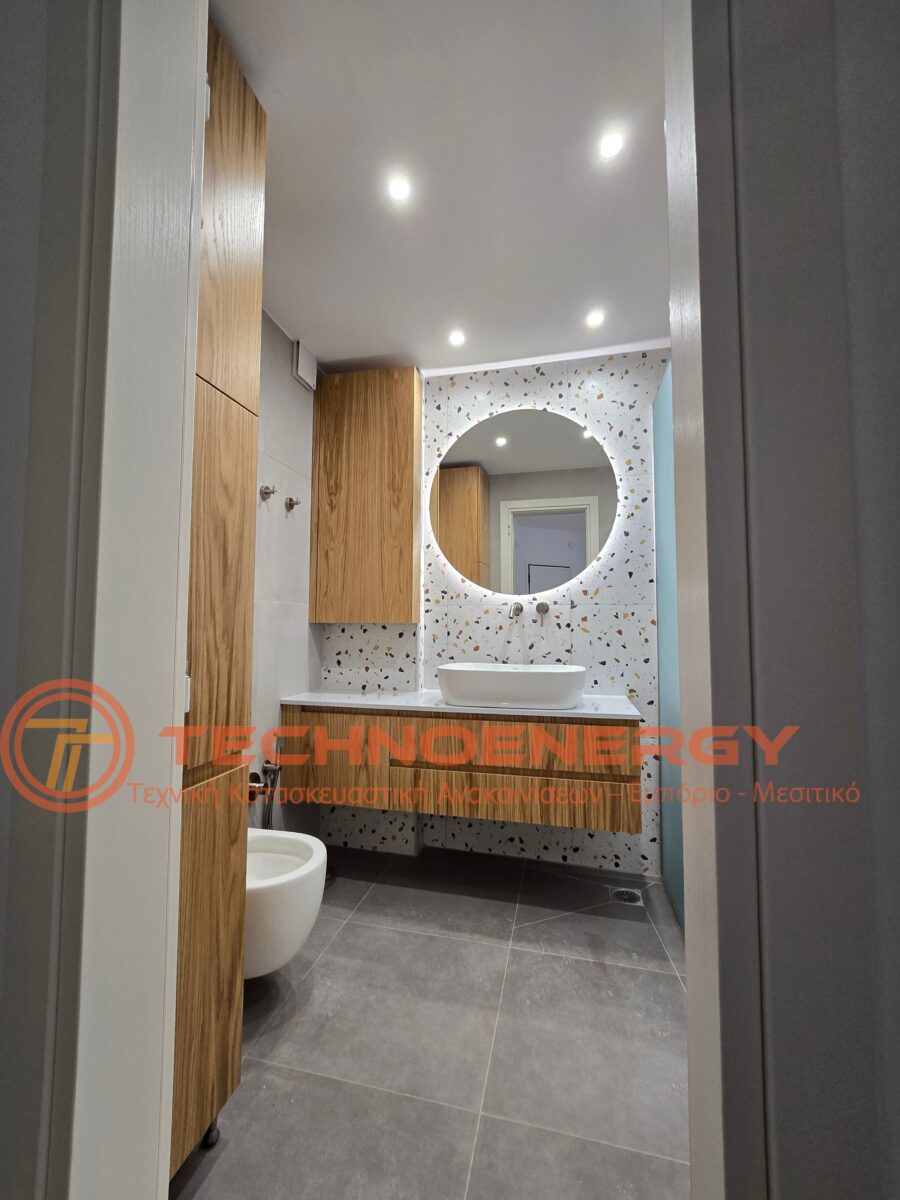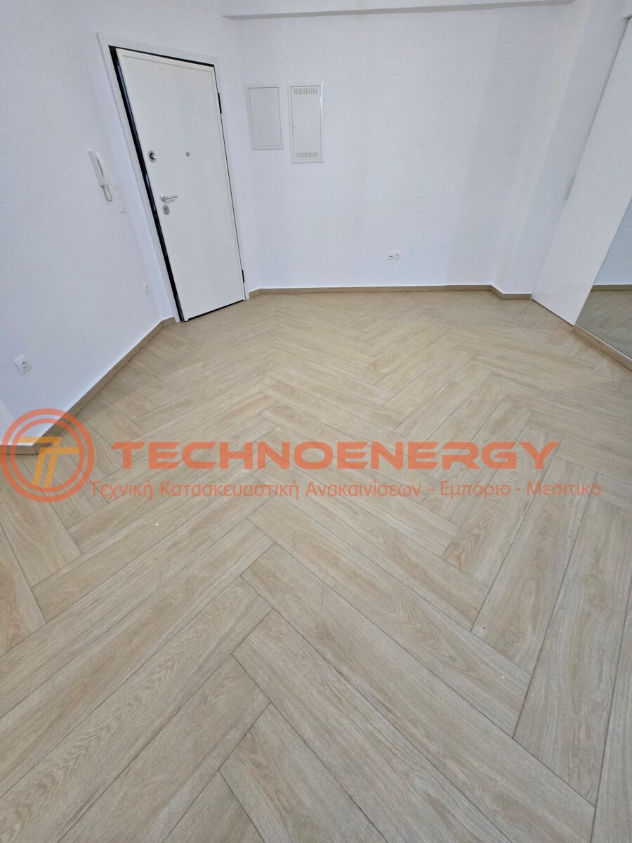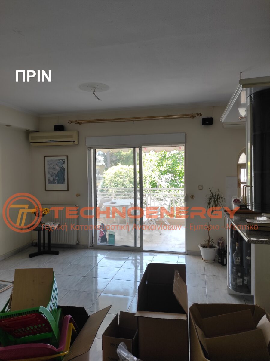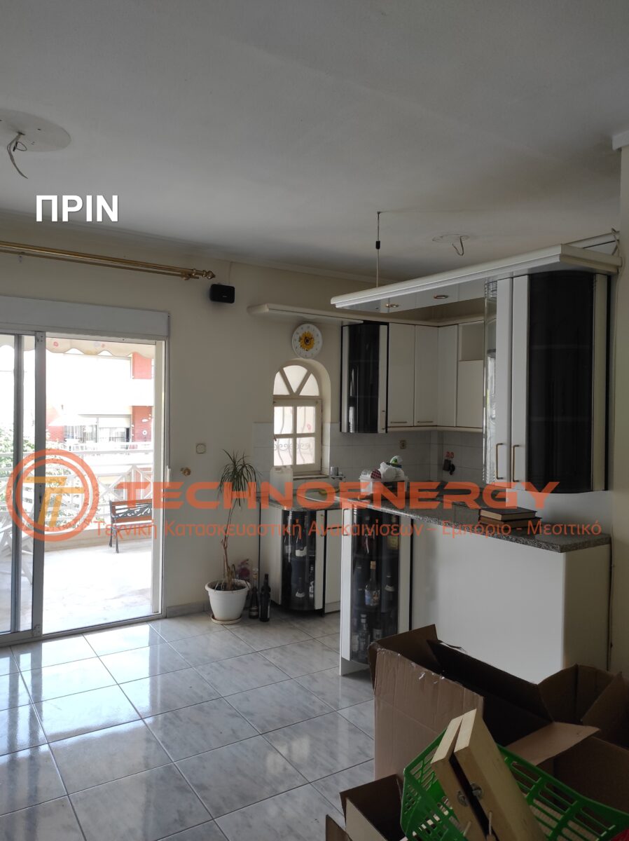 Πλήρως ανακαινισμένο διαμέρισμα στην περιοχή της Καλαμαριάς με σκοπό την ιδιοκατοίκησή του. Τοποθετήθηκε το ίδιο πλακάκι σε όλο το διαμέρισμα και το μπάνιο. Στο σαλόνι το πλακάκι τοποθετήθηκε με πλέξιμο ώστε να είναι σαν ψαροκόκκαλο. Στο μπάνιο έγινε κατασκευή επίπλων από πλακάζ θαλάσσης. Τοποθετήθηκαν εσωτερικές πόρτες laminate. Η κουζίνα κατασκευάστηκε από το συνδυασμό ακρυλικού και μελαμίνης με duropal πάγκο. Έγινε κατασκευή συρόμενης πόρτας με καθρέφτη ώστε να διαχωρίζεται η σαλοκουζίνα από τους υπόλοιπους χώρους.