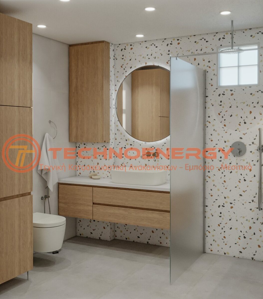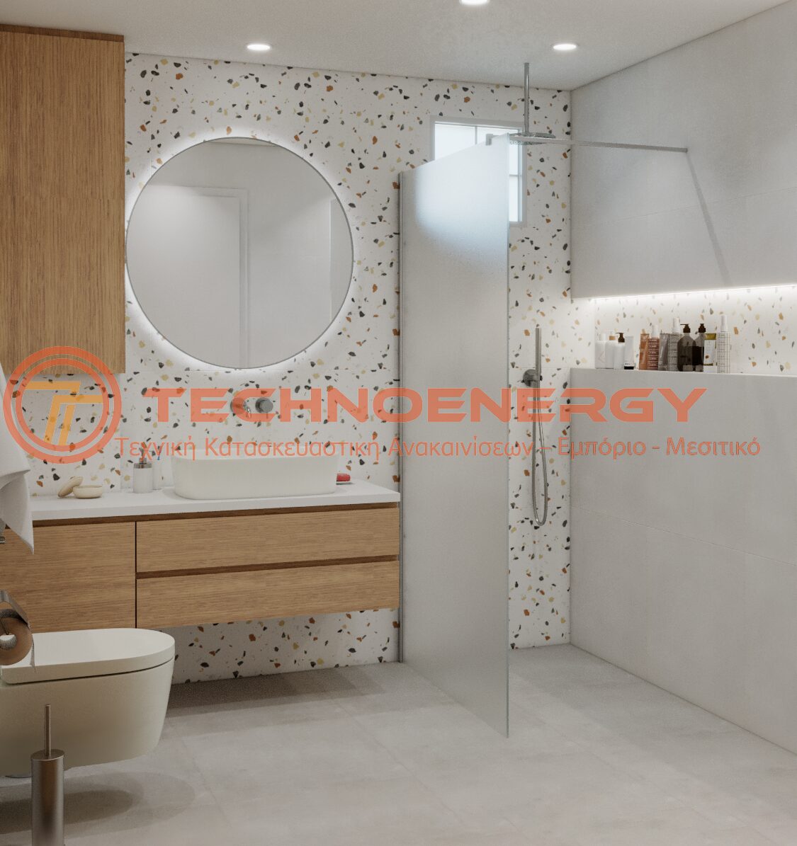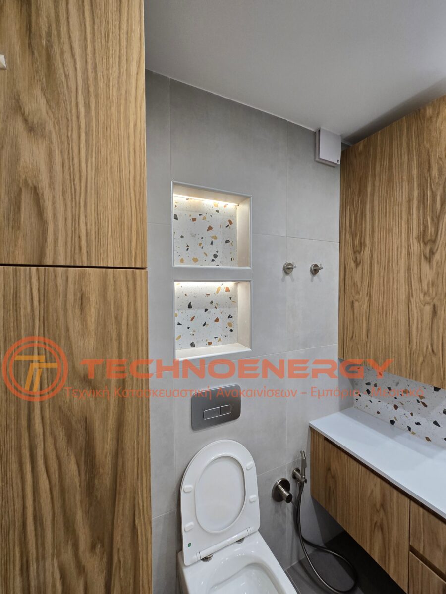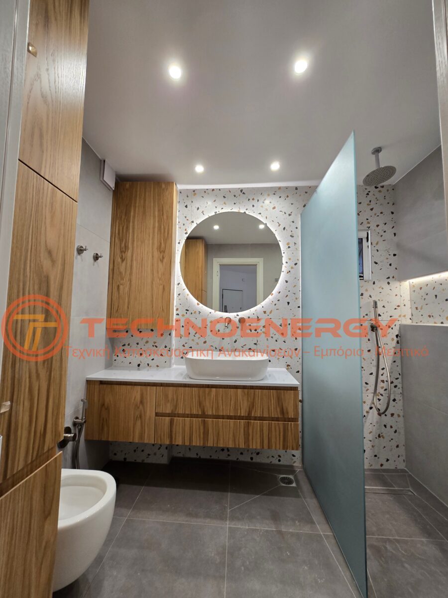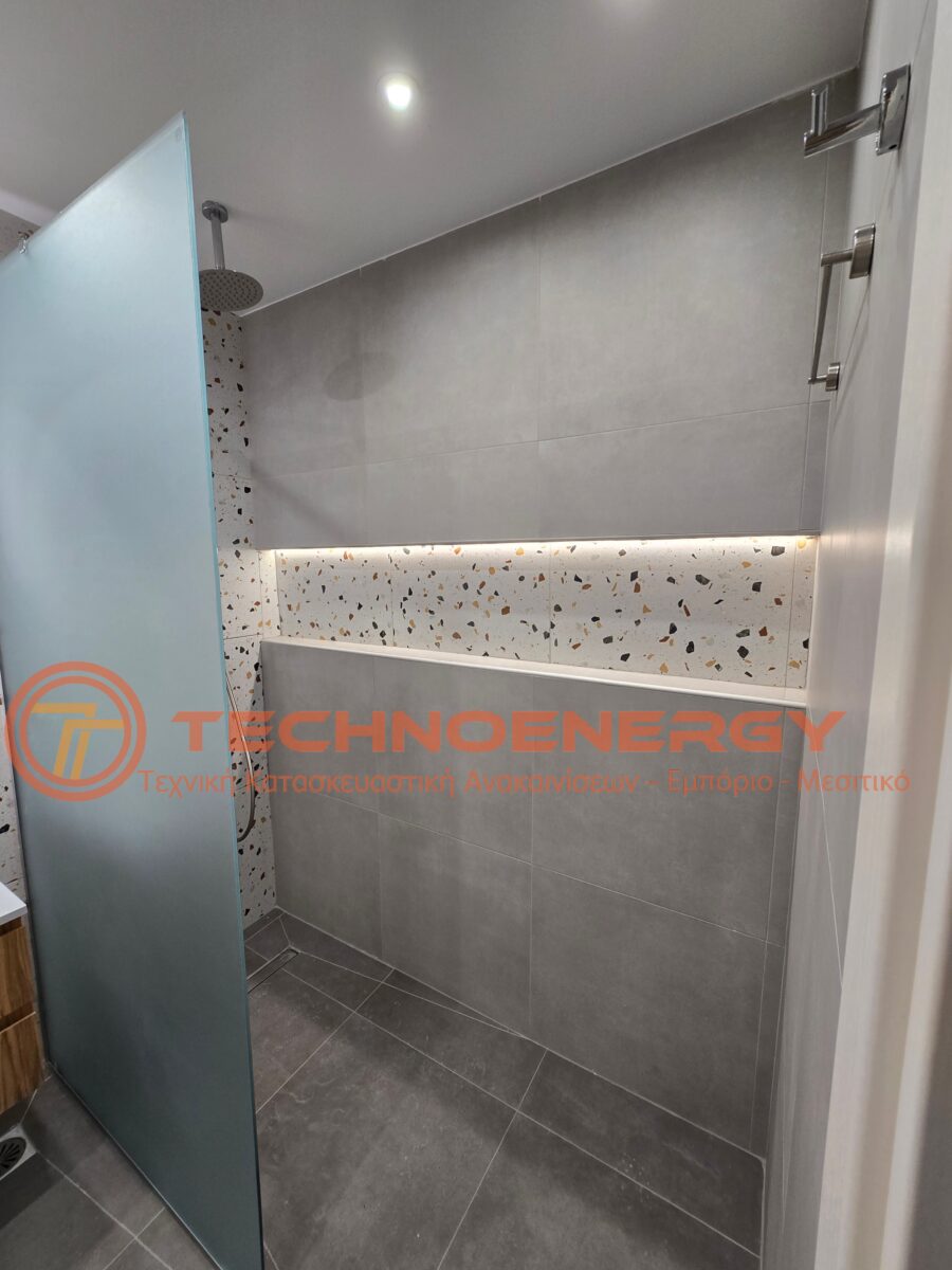 Πλήρως ανακαινισμένο διαμέρισμα στην περιοχή της Καλαμαριάς με σκοπό την ιδιοκατοίκησή του. Τοποθετήθηκε το ίδιο πλακάκι σε όλο το διαμέρισμα και το μπάνιο. Στο σαλόνι το πλακάκι τοποθετήθηκε με πλέξιμο ώστε να είναι σαν ψαροκόκκαλο. Στο μπάνιο έγινε κατασκευή επίπλων από πλακάζ θαλάσσης. Τοποθετήθηκαν εσωτερικές πόρτες laminate. Η κουζίνα κατασκευάστηκε από το συνδυασμό ακρυλικού και μελαμίνης με duropal πάγκο. Έγινε κατασκευή συρόμενης πόρτας με καθρέφτη ώστε να διαχωρίζεται η σαλοκουζίνα από τους υπόλοιπους χώρους.