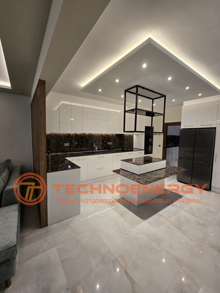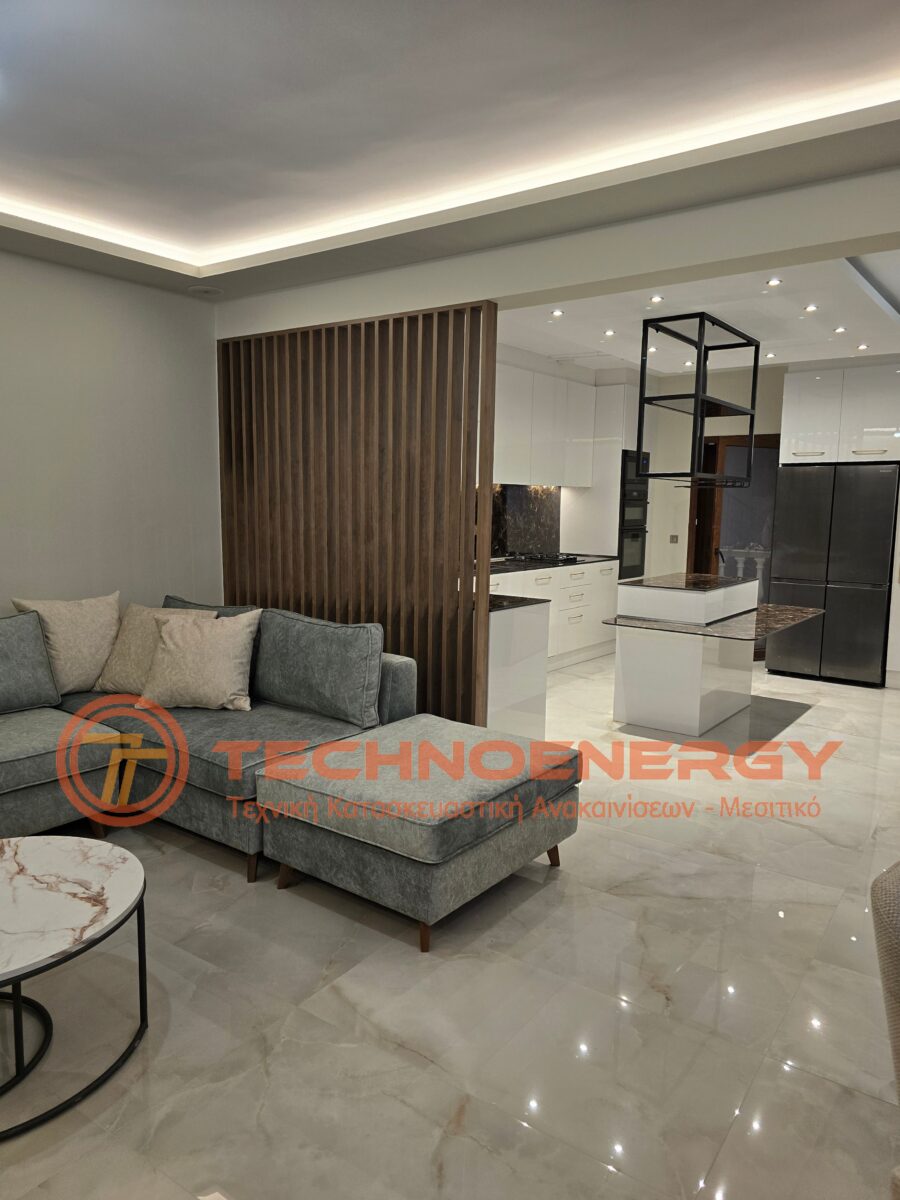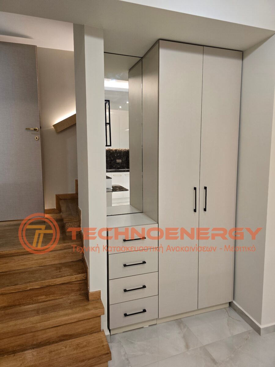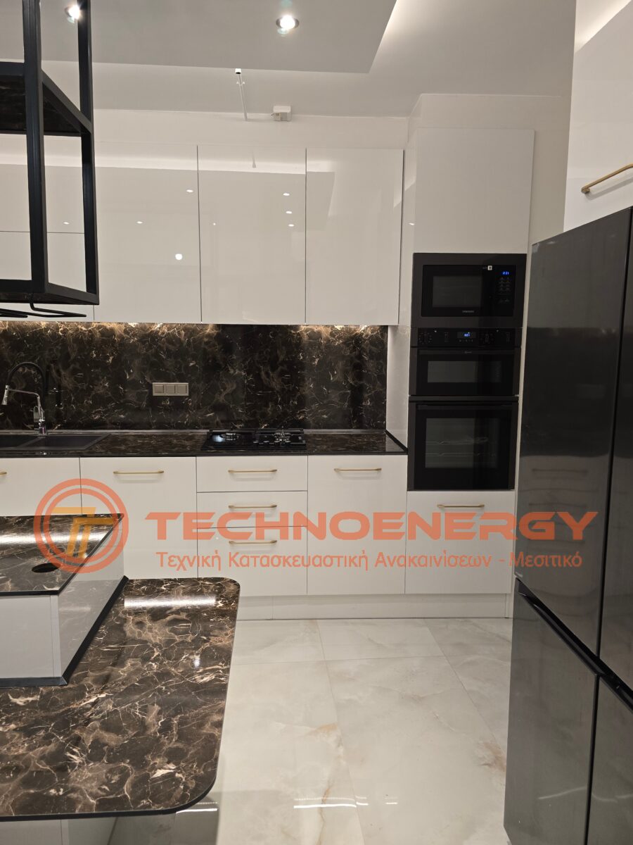 Πλήρως ανακαινισμένη μεζονέτα στην περιοχή του Ωραιοκάστρου με σκοπό την κατόικησή του μετά από πυρκαγιά. Έγινε εσωτερική αλλαγή διαμόρφωσης για την δημιουργία τριών δωματίων , βεστιαρίου, αποθήκης και μπάνιου στον επάνω όροφο, ενώ ο κάτω όροφος παρέμεινε ως είχε σε διαρρύθμιση. Τοποθετήθηκε πλακάκι σε όλο το διαμέρισμα, το μπάνιο και το WC, εκτός από την σκάλα που τρίφτηκε και τοποθετήθηκε καινούρια κουπαστή. Στο μπάνιο δημιουργήθηκε χτιστός πάγκος με νιπτήρες από πλακάκι. Η κουζίνα κατασκευάστηκε από ακρυλικό με πάγκο compact. Πάνω από τη νησίδα έγινε σιδηροκατασκευή. Έγιναν κατασκευές γυψοσανίδας στο σαλόνι, την κουζίνα και τα δωμάτια. Εξωτερικά έγινε εφαρμογή θερμομόνωσης.